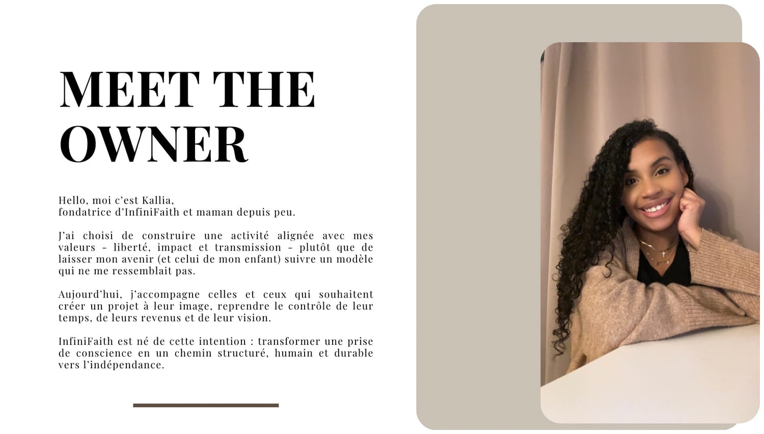 Avec InfiniFaith, je t’aide à identifier ce que tu peux offrir, ce qui a de la valeur sur le marché et ce qui te correspond vraiment.